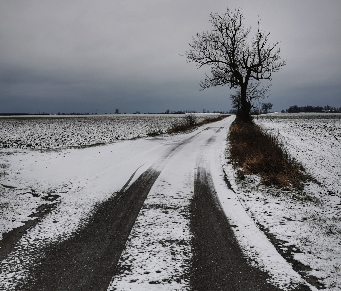 Tutaj już zaczynało się robić niebezpiecznie. Asfalt znikał pod warstwą zamarzniętego śniegu i lodu. Na szczęście samochodów na drogach prawie nie było z racji niedzieli, więc można było jechać pasem asfaltu, niekiedy nawet środkiem drogi.